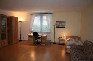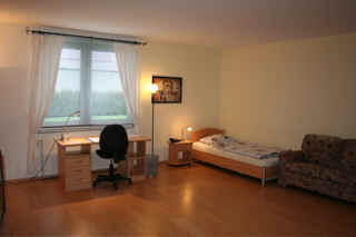 ist ausgestattet mit Bett (inkl. Zudeck und Kissen), Nachtschrank, großem Schreibtisch mit Bürostuhl, Telefon, Kleiderschrank, Regalen und Schränken für Ordner etc.