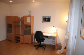 Nachtschrank, großem Schreibtisch mit Bürostuhl, Telefon,